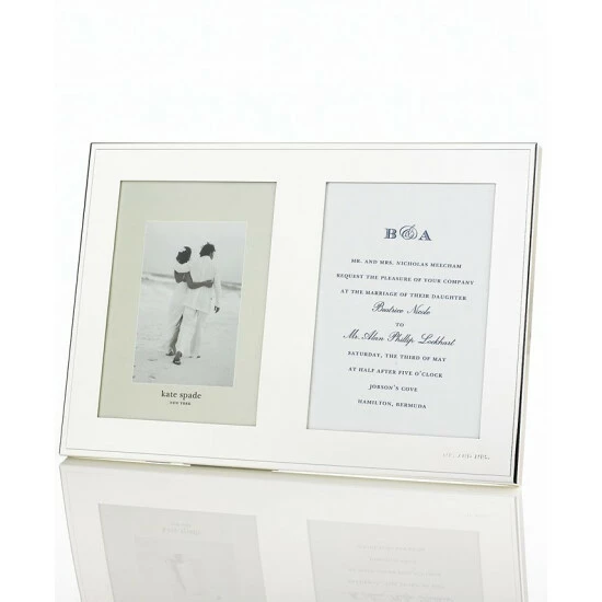 Polished to a lustrous mirror-like finish, this elegant double invitation frame is crafted in silver-plated metal, lending sheer radiance to your finest photos and memorabilia. With “Mr. & Mrs.” engraved in the bottom right corner. Holds two 5″ x 7″ photos side by side.
