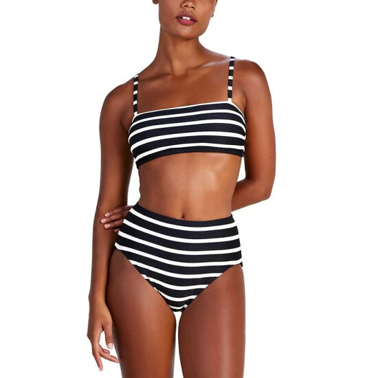 Earn your style stripes with kate spade new york’s beautiful black and white bikini, featuring a timeless bandeau bikini top and flattering high-waist bikini bottoms.